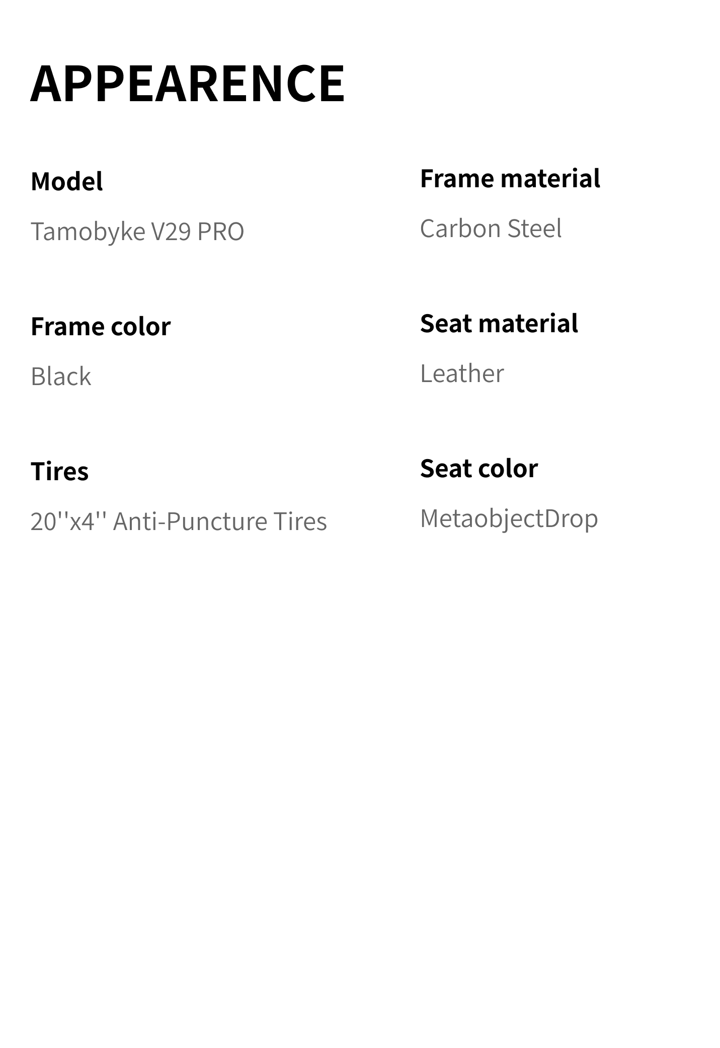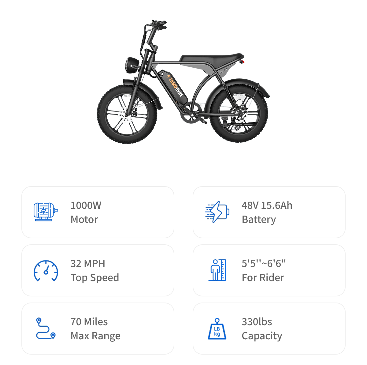 Tamobyke V29 delivering up to 1000W motor. It features a top speed of 28 MPH, 80 N·m torque, and can conquer 35° slopes, ensuring powerful performance across all terrains.