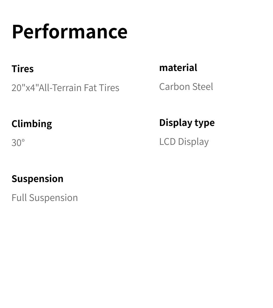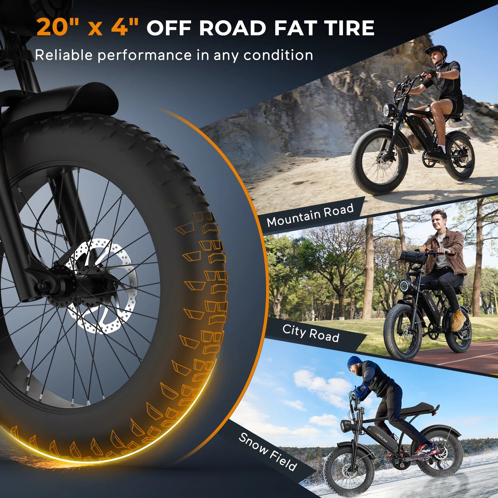 20"x4" off road fat tires or rocky trails with exceptional stability and traction, enjoying effortless control on every adventure.