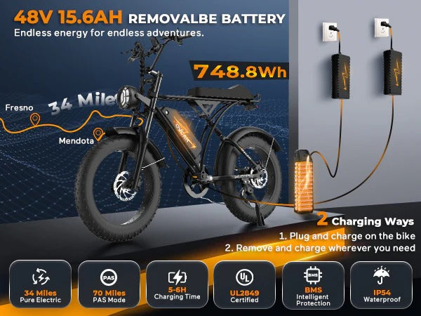 Delivering 70-mile PAS range (34-mile electric), this UL2849-certified battery features IP54 waterproofing and intelligent BMS protection. Fully charges in 5-6 hours for worry-free adventures across all terrains.