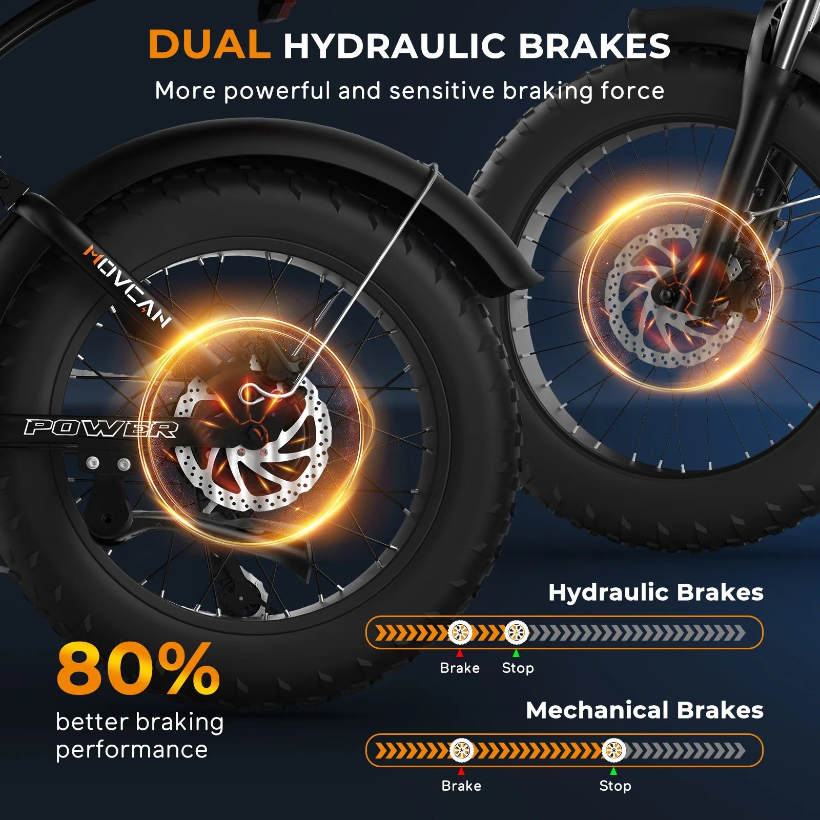 Movcan V60's dual hydraulic brakes provide 80% stronger stops instantly. Fade-resistant discs ensure safe high-speed control on all terrains—hills, wet roads, and beyond.